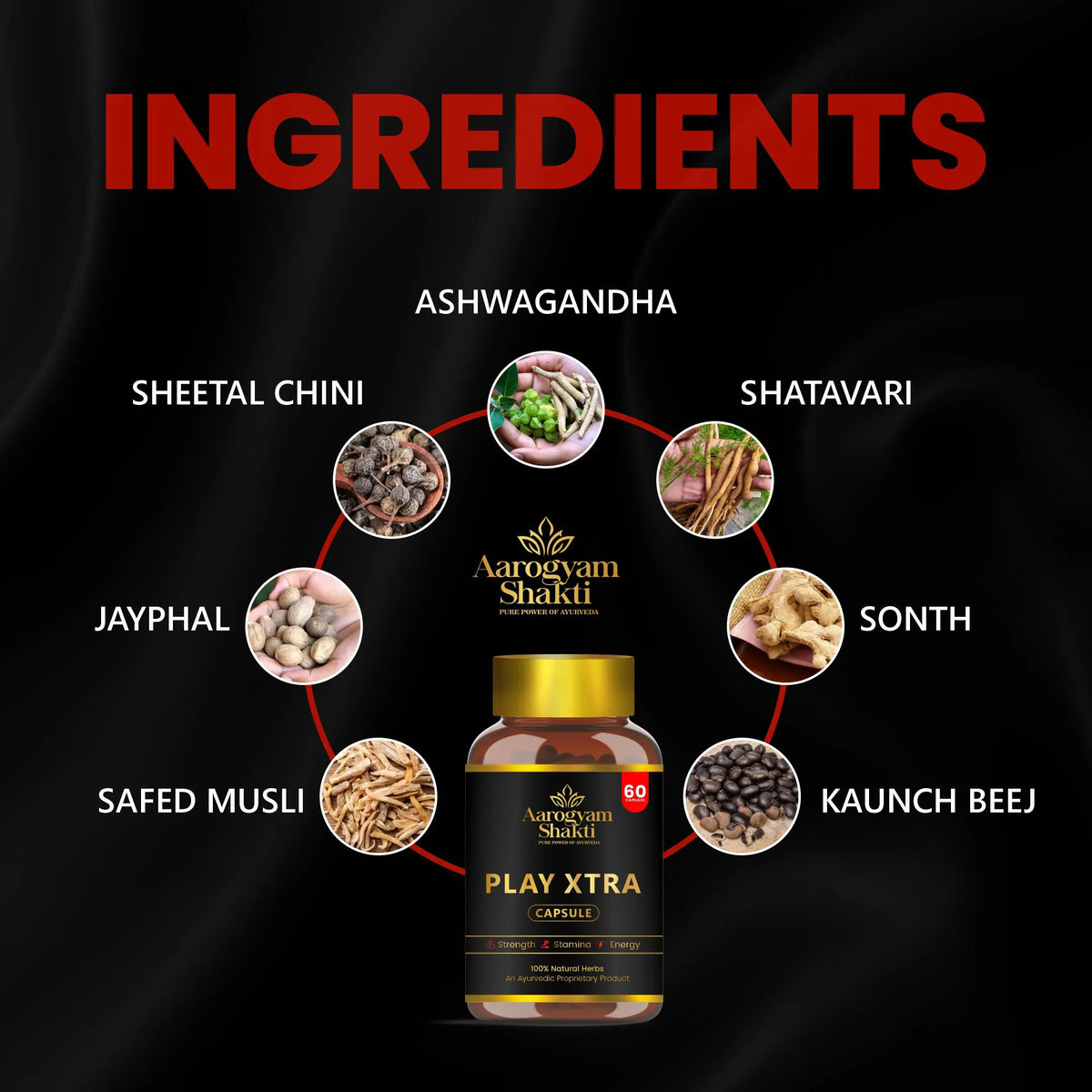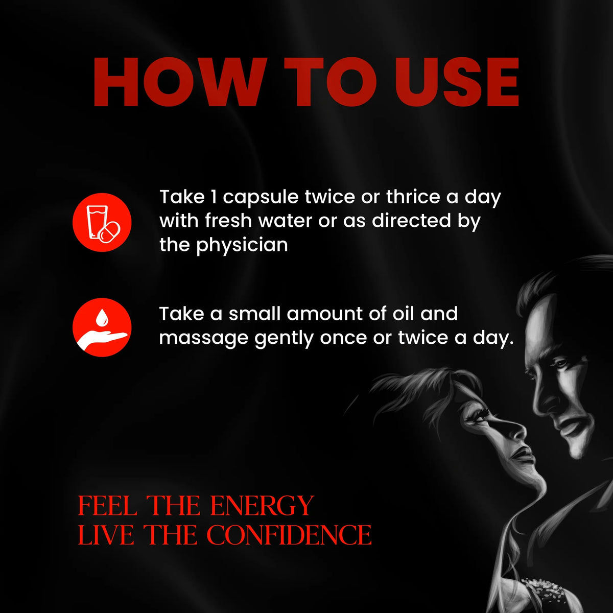 The Combo pairs the Ayurvedic vitality-support oil (Play Xtra Oil) with the oral supplement (Play Xtra Capsule), aiming to support overall energy, stamina, confidence, and general wellness through both internal and external Ayurvedic care.